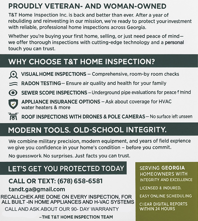 "I couldn't be happier with my experience with T&T Home Inspections. They were punctual, professional, and very thorough. I would definitely recommend."